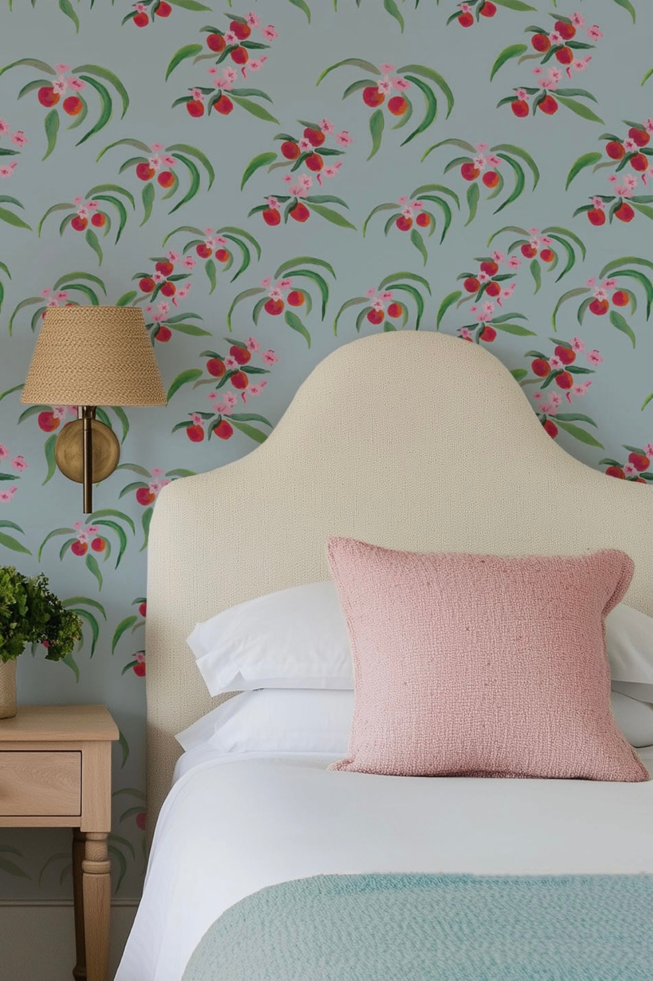 Full with the vibrant colours of summer, blue skies and fruitful orange trees can enter your home with this feel-good wallpaper design. Inspired by cherry blossom, Orange Blossom Sky Blue is the ideal design for a room in need of some joy! Make it look fabulous and pair with a coordinating blue paint & some rich rouge interior accessories.